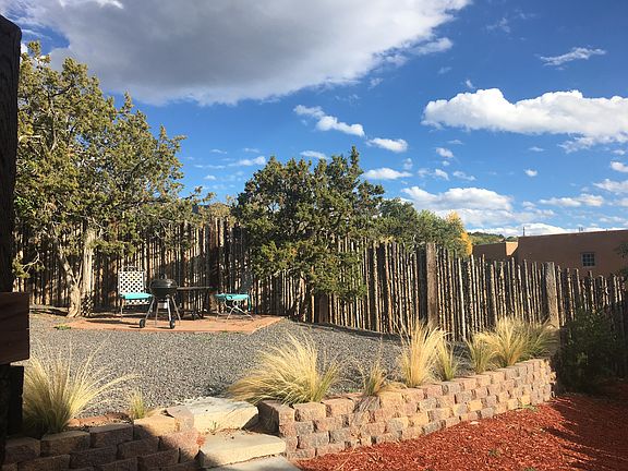 Featuring a large breezy covered deck (portal) with views of the mountains. A/C is available in the open kitchen/dining room and the primary bedroom. The primary bedroom suite has a new king sized memory foam bed and private full bath, the two additional bedrooms are furnished with a queen beds and share a full bath, off the hall. The home also has a separate study with large oak desk. The southwest decor is centered around antique furniture, Persian rugs and original art. Private coyote fenced yard is accessible out the front door. Heavy duty washer and dryer are in the rental. Rent includes all utilities and high speed internet. Two off street parking spots and carport are located by front door. This home has an attached casita and is available from now until January 29, 2026. It is off of Upper Canyon road in the historic district and has hiking trails (Dorothy Stewart) accessible up the street.