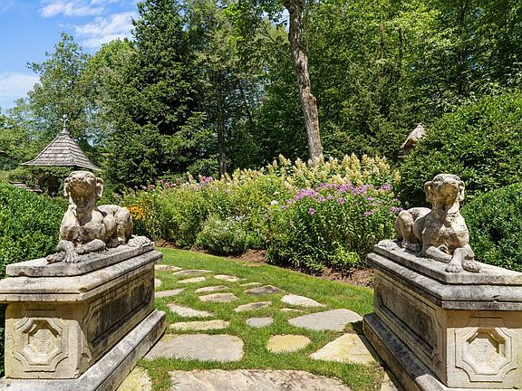 The gardens act as an extension of the home, with terraces, an outdoor fireplace, and a formal parterre. Two porches - an inviting entrance porch and a "drinking porch" off the living room and primary suite - overlook the gardens and enclosed courtyard.