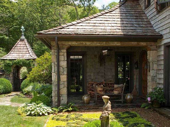 Materials were chosen with artistry and authenticity: native North Carolina granite, rough-hewn siding milled from hemlock felled on the property, reclaimed beams and barn wood from Pennsylvania, and antique accents such as milestone at the gatehouse.