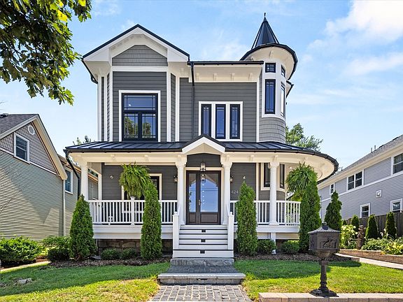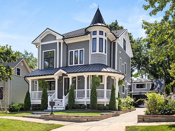 Timeless charm abounds in this magnificent home with classic aesthetics of Victorian-era architecture. From the curb you are greeted with a welcoming wrap-around porch combined with a breathtaking projecting turret. The roof is cladded in metal imported from Sweden giving both modern endurance and classic elegance. A solid triple pane oak door at the entry opens to four levels of premium materials all layered meticulously for the perfect fit and finish. On the first floor you'll find a Chef-inspired bright kitchen that is nicely appointed with top-tier appliances and large island with seating that opens seamlessly into the living/dining area. The living area features a cozy fireplace and beautiful French doors which invite occupants to the outdoor patio and lush backyard landscaping. The first floor is complete with a spacious office, powder room and separate mudroom entry. The second floor boasts a primary suite with luxury bath, walk-in closet, laundry and balcony. Two additional bedrooms with walk-in custom closets and full bath. The third floor features a designer second primary suite with beamed vaulted ceiling complimented with a spa retreat style bathroom with steam shower and soaking tub. Bright lower level with egress windows lets in an abundance of natural light and includes a recreation area, full bath and laundry room. Additional features: Hardwood floors throughout the first, second and third levels, tall ceilings, 8 foot doors, triple pane windows, Bose speaker system, security cameras, wood compost Belgium decking, high efficiency furnaces & air conditioners, dual zone tankless water heater, basement with radiant heated floor. Detached two car garage with spacious second floor finished area perfect for an office or recreational area. Professional landscaping includes: Lush landscaping, permeable paver driveway, cobblestone walkway and landscape lighting. Close to vibrant Downtown La Grange, fine dining and Metra. As the sun sets be prepared to marvel as the facade, driveway and backyard are illuminated with professional landscape lighting. Move-in Ready.