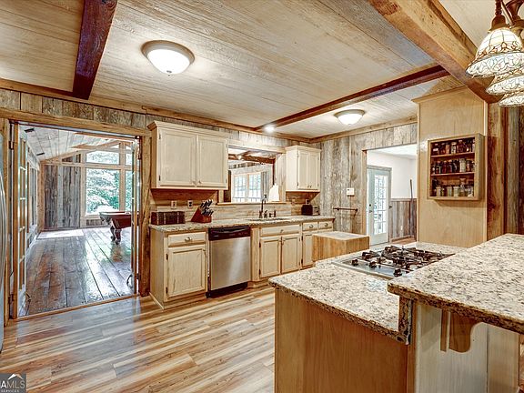 A Private Retreat with Impressive Offerings! Nestled on 8.3 picturesque acres with private lake frontage, this stunning 3,555 sq. ft. mountain-style home offers the perfect blend of seclusion and convenience, just 25 minutes south of Hartsfield-Jackson Atlanta International Airport. Located just five miles from shopping and Hwy 19/41, the property is accessible via a limited-access road ending at the Clayton County Water Authority, ensuring ultimate privacy. Step inside this spacious four-bedroom, three-and-a-half-bath home to find a thoughtfully designed layout featuring a cozy den with a warm gas fireplace, and living room open to the kitchen, a game room complete with a pool table and bar alongside a wood-burning stove for those chilly nights. The living room, kitchen and game room all have the added detail of 100 year old reclaimed wood from an old barn lining the walls. The kitchen boasts an eat-in bar, perfect for casual meals, and flows into a formal dining room ideal for hosting gatherings. The home also includes a functional mudroom with laundry facilities and a relaxing outdoor patio with counter space, a fire pit, and breathtaking views of the surrounding landscape. Exterior Features: -Four versatile outbuildings: a storage shed, woodworking space, garage and a well house. -A carport accommodating four vehicles and additional parking for up to ten, including motorhome parking. -Lush acreage full of blooms during the Spring and Summer seasons. Whether you're sipping coffee by the lake, enjoying a night around the fire pit, or crafting in the workshop, this property truly offers a little bit of heaven. Located in the highly sought-after Hampton, GA area, this unique property combines rural charm with close proximity to city amenities. Schedule your showing today to experience the tranquility and allure of this unique property.