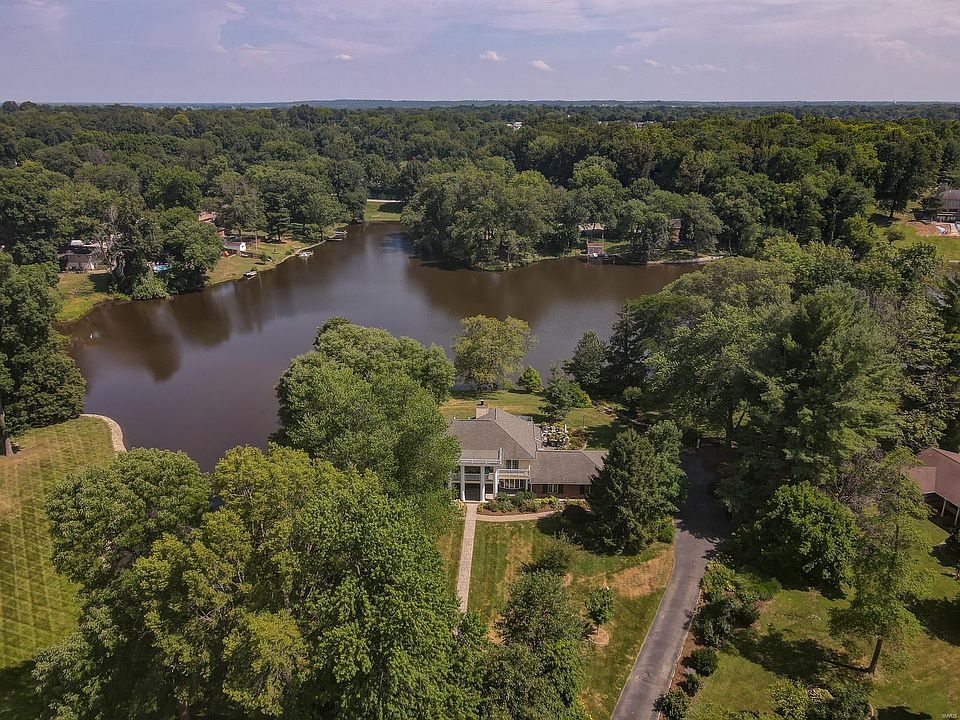 Striking from every angle, this home is on 4.6 acres & offers panoramic lake views. Spacious rooms & luxury amenities abound, most notably the award winning kitchen & master bath which were featured in St Louis Homes Magazine. Main level is designed for entertaining, amenities include tigerwood flooring throughout, 2 living areas, formal dining, 2 fireplaces, office, walk-thru butlers pantry, extensively upgraded kitchen w/center island & breakfast rm. A view swept glass conservatory across the back is heated & cooled for year round use. Sophisticated master suite has custom designed closet, built-ins, fireplace & private bath w/oversized shower. The upper level has 2 additional bedrooms, additional 2nd floor laundry & a balcony spanning the front of home adds to the livability. Office on main level has plumbing access for potential main floor master addition. Other features include abundant storage space, side entry oversized garage for tandem parking & cul-de-sac lot.