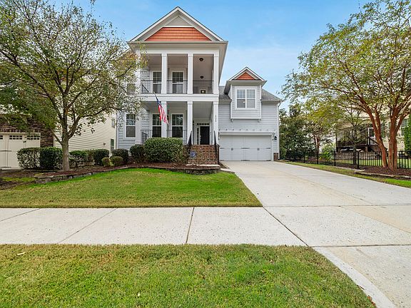 Discover the best of resort-style living in this stunning, North-facing 3,660 sq. ft., 5-bedroom, 4.5-bath home with a bonus room, lovingly cared for by its original owners. A beautiful sitting porch and balcony above welcome you into the grand foyer. The main floor is designed for effortless living and entertaining. A convenient guest suite with a full bathroom offers a comfortable and private space on the main level, perfect for multi-generational living or a dedicated office. The gourmet kitchen—the heart of the home—features a gas stovetop, a large, granite island with a sink, and a spacious pantry, with beautifully refinished cabinets, soft-close doors, and a new backsplash. A separate dining room, breakfast nook, and a grand living room complete the main level, where a cozy, double-sided fireplace seamlessly connects the living room and sunroom. The spacious layout continues upstairs. A peaceful owner's suite provides a true retreat upstairs, complete with a full bathroom that features a large tub and a separate shower. The owner's suite also opens to a balcony, offering a lovely view overlooking the neighborhood. The second floor also features three additional bedrooms, one with a full en-suite bath, and a versatile bonus room that could serve as a 6th bedroom. This home has been meticulously maintained and upgraded for luxury living. The outdoor oasis, enhanced in 2019, includes a heated pool and spa with a beautiful waterfall; the spa's gas furnace was upgraded in 2025 for improved efficiency. The backyard, professionally landscaped and fully fenced in 2019 with privacy screens, is an entertainer's dream. The deck was expanded in 2024 with a new electrical awning, and a smart addition in 2024 was a new exterior entrance giving pool guests convenient access to a mudroom/changing room and an adjoining half-bath with a stylish barn door. Energy efficiency is maximized with a 14.4 MW High-Efficiency Solar Panel System in 2020, a Level 2 EV Circuit in 2023, and a replaced water heater in 2025. The roof was replaced in 2022. Enjoy the beautiful location and community amenities. The community clubhouse, pool, playground, and volleyball court are just a nice walk or very short drive away. Experience the ultimate blend of connectivity and convenience. Located just minutes from RTP and RDU Airport, and with easy access to Highways 540, 40, and 55, your commute is effortless. The lifestyle is unparalleled, with top-rated schools and exceptional access to vibrant shopping, a rich selection of dining, beautiful parks, greenways, and public tennis and pickleball courts all just moments away.
