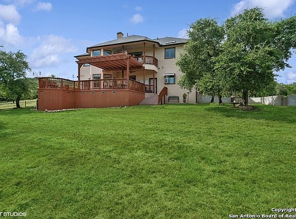 Expansive Hill Country retreat with acreage and plenty of wildlife. Furnished home with Four-bedroom, 3.5-bath, 3900 sq ft. Downstairs you will find the gourmet kitchen, large double walk-in pantry, breakfast nook and separate dining room, enclosed office, and living room with propane fireplace. Upstairs the primary suite features large picture windows that overlook the nearby hills. The large master bathroom has a separate shower and tub, and a large walk-in closet with extensive shelving. A private balcony off the primary suite is the perfect place to watch the sunset. Also upstairs are 3 full bedrooms, 2 full Jack-and-Jill bathrooms, laundry room with newer front-loading washer and dryer, and a media room. Outside you will find a very large deck overlooking the yard with newer kids' jungle gym. NISD SCHOOLS.
