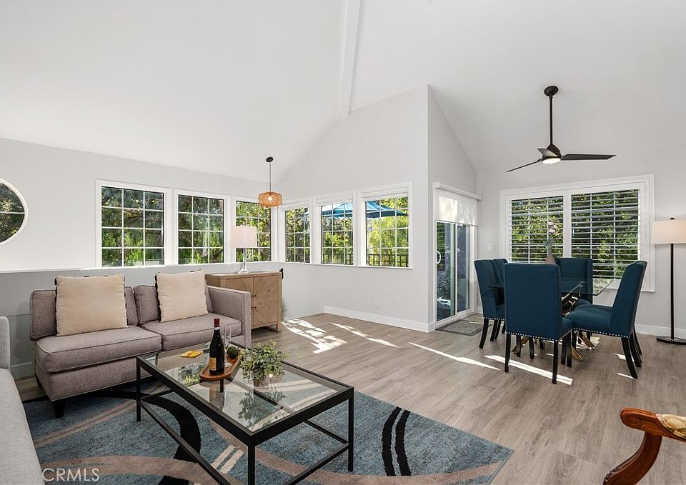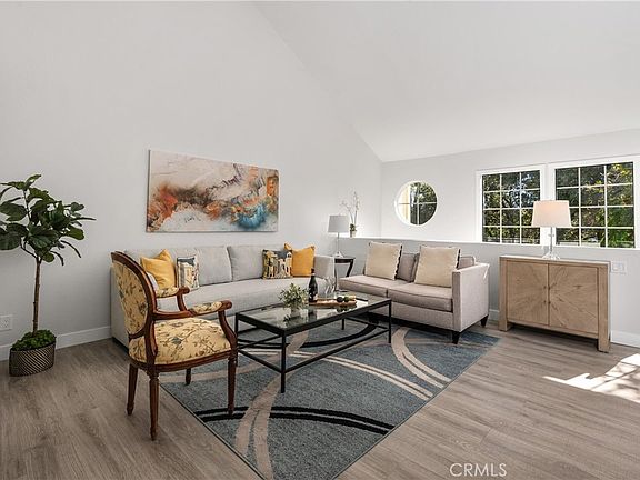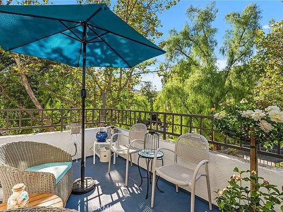 Experience the calming effect of this elegant end unit condo in the first building of the Steeplechase gated community in Calabasas! This spacious 1 bedroom, 1 bath beauty is bathed in natural light and enjoys views of the beautiful trees and surrounding foliage from the 6 large windows in the upper living area. It is also conveniently located by the clubhouse with gym and pool/spa area. All new interior doors and laundry bi-fold doors, new floors, new fan, and new paint. The primary bedroom walk in closet has a French door for added openness and visual appeal and is roomy enough to have a desk nook in the corner. The upgraded bathroom features a smart light with music pairing capabilities. The kitchen boasts quartz countertops and curated appliances that make navigating around efficient and maximizes space. Cozy up to the wood burning fireplace in the living room and enjoy the openness of the cathedral ceilings or take in the gorgeous views from the private open outdoor balcony. The attached, full size, single car, direct access garage also enhances privacy and security. Easy freeway access at Lost Hills and only a block away from upscale dining, retail and grocery shopping. This exquisite condo brings the perfect blend of tranquility and refined stylishness together. A must see for the value and experience!