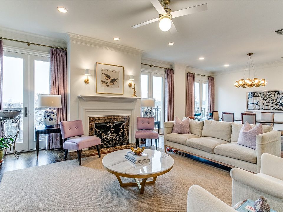 Exquisite, light-filled corner residence at the Park Highlander! Direct elevator access into a private foyer and entry with powder bath, all recently updated with oak hardwood floors & wall coverings. Large combined living & dining room with Juliet balconies overlooking the pool. Kitchen features built-in SubZero, double convection Thermador ovens, six-burner Wolf gas cooktop and Asko dishwasher. Additional space adjoining kitchen, with custom built-ins is perfect for den or office. Primary suite and bath has dual vanities, custom built-ins, walk-in closet, separate shower and spa tub. Guest bed has an en-suite bath with custom built-ins and balcony. The boutique Park Highlander luxury condos are well located within walking distance to the Shops of Highland Park and numerous restaurants. Building amenities: on-site manager, 24-hour concierge, updated lobby, fitness center as well as swimming pool & gardens. Residence comes with two assigned parking spaces.