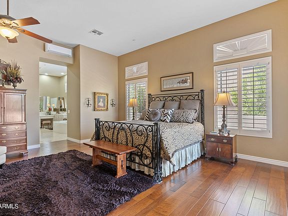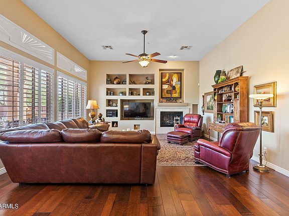 Anthem Country Club~Stunning 3 bedroom, den with 3 full baths + 2 powder baths. Situated on over 1/4 acre golf course lot with distant mountain views, this Verrazano (or Castille) floor plan features newer roof & state-of-the-art HVAC system! Kitchen features newer stainless appliances with gas cooktop & wall ovens, high-end slab granite & backsplash, island with breakfast bar & updated cabinetry. Backyard features award-winning pool & spa (won Gold International Award of Excellence - one of only 57 in 2002!) with water features, black marble PebbleTec & gold accents, expansive bonamite decking w/ multiple levels, outdoor kitchen including built-in gas BBQ, beverage cooler & burners. Hand-scraped Los Olivos maple hardwood floors, plantation shutters & so many more incredible upgrades!
