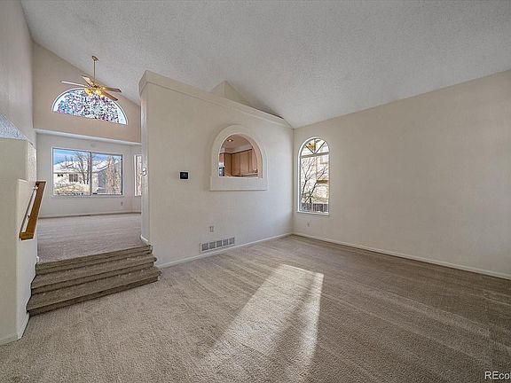 Charming 4 bed/4 bath home in Green Valley Ranch! High, open cathedral ceilings open up the interior of the home for the perfect place to gather, with a large eat-in kitchen, remodeled 3/4 bath on the main level with fresh paint and carpet throughout. *An added and updated finished basement offers a dedicated bedroom with 2 egress windows, 3/4 bathroom, flex room with wet bar, and berber carpeting. Ample storage, large manicured front and private backyard with patio. Walking distance to Green Valley Ranch Park and Playground, New Costco, restaurants and shops with convenient access to DIA, train to downtown and easy access to I-70. This light and bright spacious home is ready for your finishing touches!