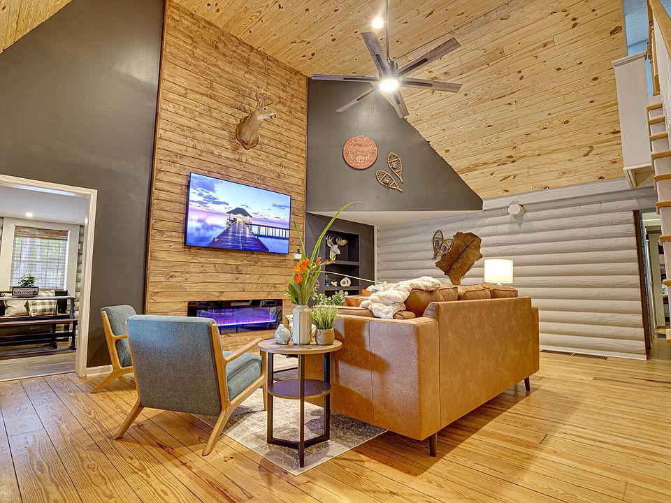 Comfortable Living Spaces: each room is designed for comfort and relaxation, including a cozy living area with a 75" smart TV and electric fireplace