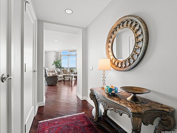This corner unit features captivating south and east-facing views from the spacious open concept living - dining area, showcasing both the downtown San Antonio skyline and the verdant expanse of The San Antonio Country Club. The interior features a classic finish out with warm tones, complemented by a gourmet kitchen equipped with Miele appliances, gas cooking, and a Sub-Zero refrigerator. Primary suite with spa style ensuite bathroom and large walk-in closet. Stacked washer/dryer closet in unit. Residents enjoy a concierge lifestyle with dual balconies providing breathtaking vistas. The Broadway building itself is renowned for its full-service amenities, including valet parking, a 24-hour concierge, a resort-style heated pool and spa, a state-of-the-art gym, grilling stations, dog parks, sport courts, and private workout studios, ensuring unparalleled comfort and convenience.