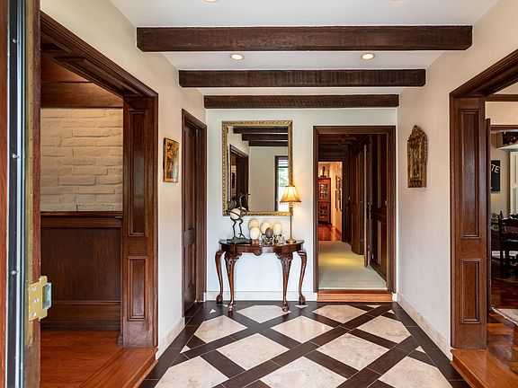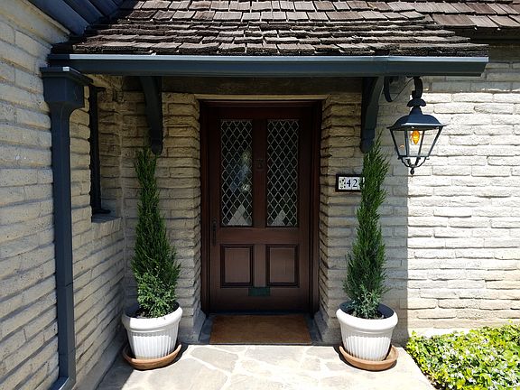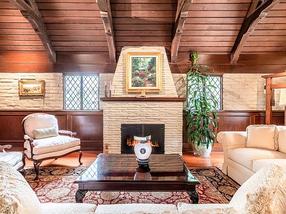 Stunning single level English country manor, nestled in the coveted enclave of the Virginia Country Club. Expansive yet intimate, this home exudes old world charm with modern conveniences. From the moment one enters, you are greeted with unparallel architectural details throughout the home such as: exposed stone walls, hardwood floors, custom mahogany paneling, built-in cabinetry and custom millwork, wainscoting, leaded and stained-glass windows; to name a few. Entertaining opportunities abound. From the limestone and tile entry that leads you to the dramatic formal living room with a beamed and vaulted wood ceiling and grand stone fireplace, the tour just begins. The den features a stone Normandy fireplace, roughhewn vaulted ceilings, stained glass windows, finely detailed mahogany paneled library area with a wood coffered ceiling, cushioned reading alcove, and a charming vintage wet bar. The hall, with its inlaid hard wood flooring and recessed lighting, leads to 2 guest rooms, modern bath and the stunning master suite with original French inspired terra cotta floors. The master bath features tumbled marble tile, bathtub, separate shower and large walk in closet. The formal dining room features, leaded windows, walnut parquet floors, wainscoting and crown molding. The elegantly remodeled kitchen boasts designer stainless appliances, granite counters, and fine custom cabinetry, adjacent is the light filled breakfast room with built in china cabinet and hutch. The charming exterior grounds are abundant with majestic towering trees, mature garden specimens and manicured shrubbery. Flagstone walkways and patios are surrounded by stone walls and newer fencing making this home a tranquil and private oasis. The highlight of this entertainer's dream is the private backyard with sparkling crystalline pool and oversized spa. This is a home of old world character and romance but updated with a modern flare and innumerable designer details. A home of impeccable taste and exquisite charm.