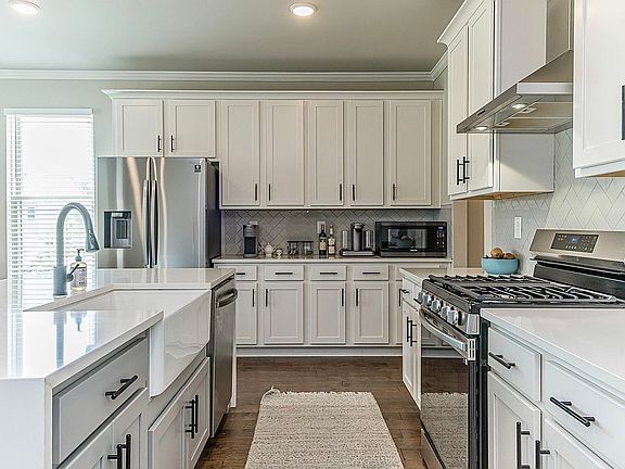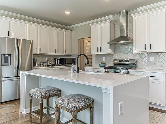 You’ll love the open layout featuring a spacious chef’s kitchen with a gas stove, vented chimney range hood, waterfall island, tall cabinets, farmhouse sink, and a beautiful herringbone backsplash. There’s also an oversized pantry and a convenient half bath tucked away just behind the kitchen. The kitchen flows right into a bright, sun-filled living room — perfect for gatherings or cozy nights in.