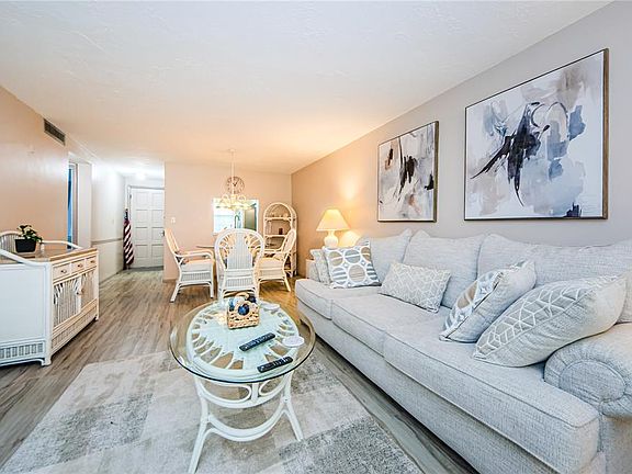 Motivated Seller! Welcome to this lovely villa with NEW, beautiful luxury vinyl flooring throughout the living area and second bedroom. NO FLOODING OR STORM DAMAGE FROM RECENT HURRICANES. FRESH PAINT AND NEW CARPET JUST INSTALLED IN PRIMARY BEDROOM (JULY 2025). The villa features an open floor plan with a pass-through kitchen window and a new stainless steel double door refrigerator. The villa includes 2 bedrooms and 1 bath, a Florida room, a washer, dryer, and a cozy back patio area. Windows include detachable hurricane curtains. No storm damage from recent hurricanes Live maintenance-free, the community of Garden Beacon Squares HOA fee includes water, trash, cable, internet, pest control, lawn care, and exterior maintenance. Enjoy the community's amenities that include a clubhouse, shuffleboard, heated pool, and more. The villa is located very close to shopping and restaurants. Garden Beacon Square condos are located 32 miles from Tampa International Airport, approximately 23 miles to the Award-Winning Clearwater Beach, and close to the very desirable cities of Dunedin, Tarpon Springs, & St. Petersburg.