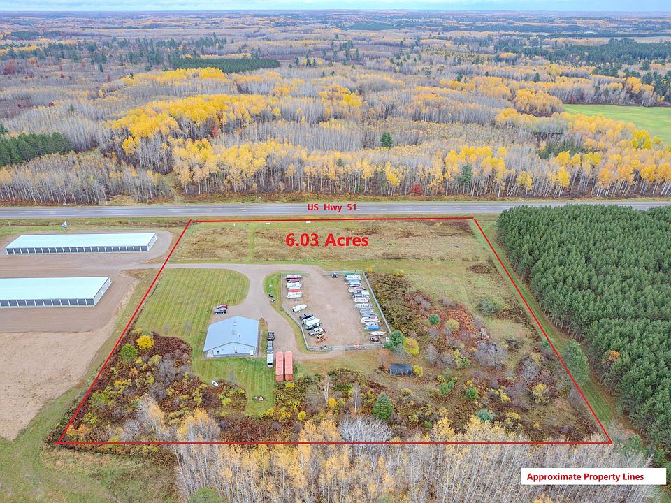 Excellent US Hwy 51 high visibility Business B-2 Property conveniently located between Tomahawk, Rhinelander and Minocqua. Spacious 6.03 acres with 515' of Hwy 51 frontage features a 48’x48’ metal pole building built in 2009. Fenced in secure boat, vehicle, equipment, trailer parking area for good ancillary income potential. Interior offers a reception and showroom area, 2 offices spaces, break room with kitchen, 1 full bath, utility/laundry room, and a 32’x48’ workshop/garage space. Soundproof insulation between offices and workspace. Concrete foundation is 5” deep with mesh and rebar reinforced with epoxy. Insulated OH doors, ventilation system, humidifier, LP furnace in shop, dual stage furnace, security and surveillance systems. Extra storage space above office is heavy equipment approved. Adjacent to snowmobile/UTV trail. Acreage provides room for expansion. Business B-2 zoning will accommodate most all business uses.
