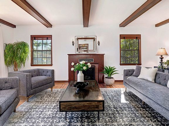 Incredible location across from Culver City's Carlson Park! This beautiful 2-story Spanish Revival style home, built in 1937, was among the first homes in the neighborhood. The spacious living room has the original oak & mahogany hardwood floors, wood-framed windows, wood-beamed ceiling & stately fireplace. The floor to ceiling picture window looks out to quiet tree-lined street. The elegant dining room has coved ceiling and opens to a light-filled wet bar alcove. The tiled kitchen opens thru arched doorway to bright breakfast room. Downstairs guest suite (5th bedroom) is used as a family room and has a glass sliding door that opens to secluded patio & lush garden. With four bedrooms upstairs there is space for kids, office & gym! Covered balcony looks out over Carlson Park. Detached guest house has a living room, bedroom & kitchen. Beautiful landscaping & covered patio behind garage. Close to downtown Culver City's restaurants & theaters. Amazing Home & Incredible Location.