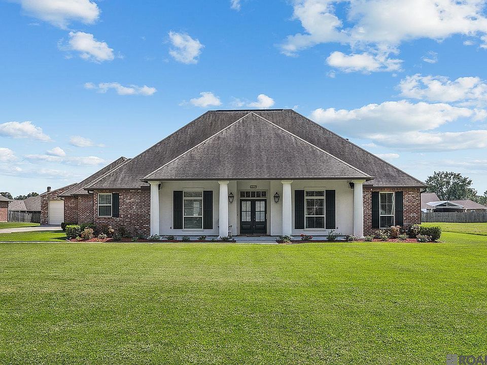Welcome to your dream home! This beautiful property offers a spacious and open living area, perfect for entertaining or relaxing with family. Stained concrete floors and crown molding flow throughout, providing a touch of elegance and durability. The flexible floor plan includes a large bonus space, ideal for a playroom or home gym. An additional bedroom can easily be used as a home office or study. The dedicated guest suite features a full kitchen and a half bath that can be easily converted to a full bath, offering a private space for guests or extended family. Outside, you'll find a massive 1,500+ sqft shop, providing endless possibilities for a workshop, storage, or your favorite hobbies. Enjoy outdoor living on the covered patio overlooking the open yard.