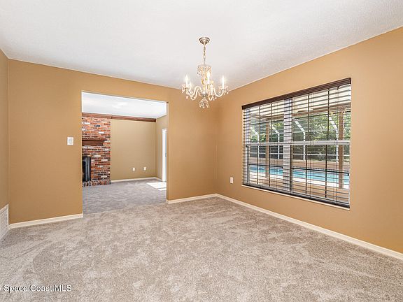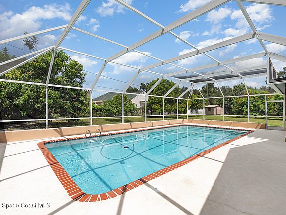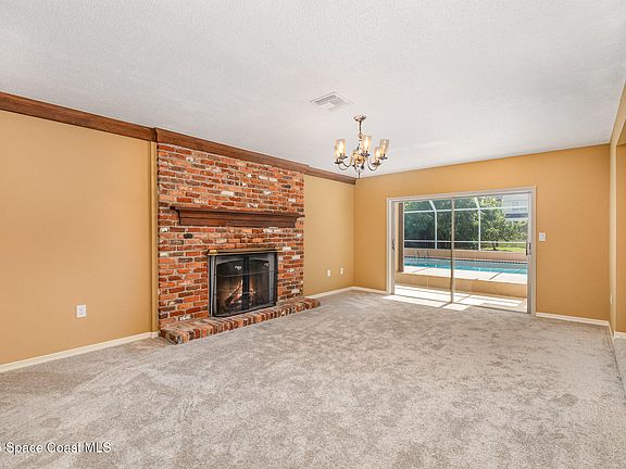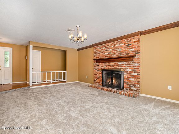 Rare opportunity for a 4/2 pool home in desirable South Merritt Island Hilltop Manor subdivision. Well-maintained home located on .57 acres at the end of a quiet cul-de-sac. Living room features a wood-burning brick fireplace and sliding glass doors that lead out to the oversized screen-enclosed pool. Large lot boasts manicured landscaping shaded by mature mango trees. Drain lines replaced with PVC in 2025.