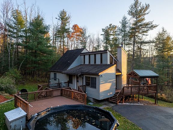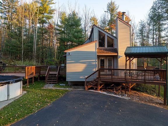Don't miss this 3-bedroom, 2-bathroom contemporary home nestled on a private, wooded 6+ acre lot just minutes from Binghamton, NY, and the Pennsylvania border. The updated kitchen and dining area flow into a spacious living room featuring a stunning stone accent wall and a cozy wood fireplace. This floor also includes two bedrooms and a full bath. Upstairs, you'll find the primary suite with its own bathroom, walk-in closet, and private deck. The basement offers a large split family room/office area, laundry, and a utility room. Outside, enjoy the expansive wrap-around deck with a gazebo, a heated pool, a chicken coop, a shed, and a paved driveway. The property also boasts private acreage with a potential pond site, fire pit area, and trails for hiking, four-wheeling, or hunting. Move in and enjoy your private retreat close to all conveniences.