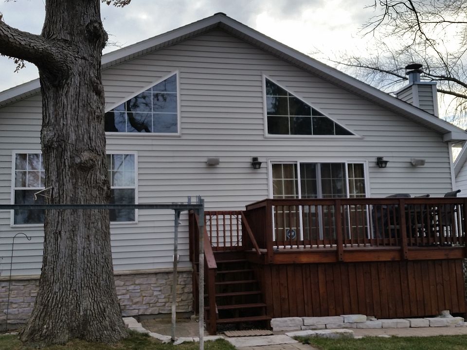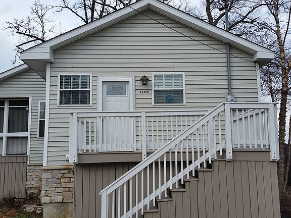 Fully furnished $339,900 (cash) includes 2010 Bennington SFI pontoon with Yamaha 70 HP 4 cycle motor, trolling motor, Humminbird 700 series Fishfinder/GPS, house furnishings, 2013 electric powered boat lift, kayak launch ramp, 2 kayaks, 1 canoe. Unfurnished: $319,900 Lakefront - Fantastic 180 degree westerly view of highly desirable Channel Lake; Great room concept with vaulted ceilings in entire home, skylights, hardwood floors, ceiling fans, wood-burning gas starter fireplace, wall mounted TV, built-in stereo with wall/ceiling mounted speakers, and sliding glass doors to lake view deck; Bright, airy, and open; Kitchen has maple cabinets, ceramic tile flooring, granite counter-tops, stainless side-by-side refrigerator, gas range/oven, microwave, and dishwasher; Master bedroom with wall-mounted TV, hardwood floor, ceiling fan, huge window view of lake, and closet space; Master bathroom with double bowl vanity, granite counter-top, large shower, ceramic tile flooring, and closet space; Additional bedroom with ceiling fan and closet; Enclosed screened in porch usable as extra sleeping space; Two decks attached to house, and a third very large deck overhanging water’s edge; Nine section dock extends from deck into lake; Additional wooden pier on canal; Paver brick parking area and walkway; State of art septic system; Well water; Utility room with washer/dryer, water purification system, water heater, water softener, gas furnace, circuit breaker panel, and storage shelves; Additional storage space available under porch, under decks, and in crawl space which has concrete floor; Community park/playground nearby. Feel free to call 815/721-9664 for showing or with any questions. Official paperwork handled through real estate attorney and title company.