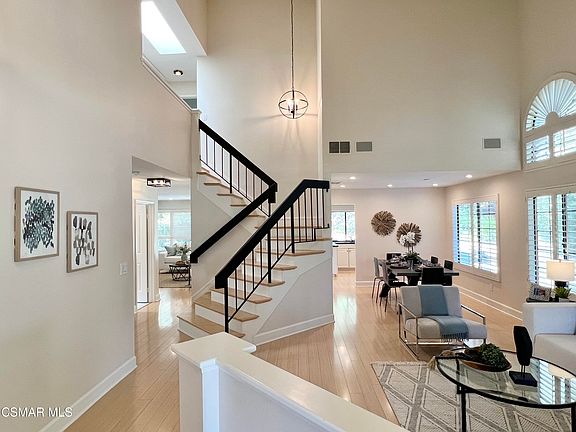 This newly renovated, turn key home is exceptionally immaculate and boasts one of the largest backyards in the development. With breathtakingly vaulted ceilings, this 4 bedroom, 3 bath home entry surrounds you with an abundance of natural light. Just past the airy and open living room & dining room is an updated kitchen with granite counters, stainless steel appliances, & a spacious walk-in pantry, all open to the family room which offers built-in surround sound, a cozy fireplace, a wall of windows, and sliding glass doors that open to the park-like backyard. The tranquil and expansive yard is perfect for relaxing and/or entertaining with it's huge grassy area, gas hook up for a BBQ, sprawling patio, and an oversized treehouse. The possibilities for enjoying the outdoor space are truly endless with plenty of room for a pool, hillside water slide, sport court, and more. Included on the main floor are a bedroom/office, full bathroom, and laundry room. As you head up the striking staircase, an impressive skylight bathes the hallway in natural light that spills into three generous sized rooms and two beautiful bathrooms. The primary bedroom has a walk-in closet with custom built-ins, and a stunning bathroom with a fabulous shower including five spa-like shower heads. Other thoughtful upgrades in this beautiful open floor plan include built-in surround sound, recessed lighting, custom wood shutters, newer wood-like floors & carpeting, built-in cabinetry, & an upgraded electrical panel. This highly desirable Deer Springs Neighborhood is adjacent to De Anza Park, located in the award winning Las Virgenes School District, and just 10 miles away from Malibu, with it's fantastic shopping, restaurants, and sandy beaches.