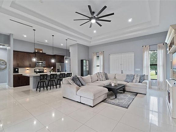 Elegant and meticulously maintained, this 2020-built 3BR/2BA, 1,763 sqft home sits on 1.17 acres in a desirable Naples location and combines Mediterranean-inspired architecture with thoughtful upgrades throughout. The property welcomes you with a custom paver driveway, lush landscaping, and striking 8’ double front doors, while inside, soaring 12-foot ceilings, tray details, and gleaming 24” tile floors create an open, airy feel. The spacious great room flows seamlessly into a chef’s kitchen featuring upgraded stainless-steel appliances, thick quartz countertops, soft-close cabinetry, a large waterfall-edge island, and a dining area, all enhanced by new light fixtures and fans. The oversized primary suite offers private lanai access, a deep walk-in closet, and a spa-inspired en suite with a glass-enclosed shower, while two additional bedrooms provide generous comfort and flexibility. Enjoy peace of mind with impact glass throughout, a generator-ready setup with Generac outlet and main panel switch, and a reverse osmosis system for pristine drinking water. Perfect for entertaining, the home also boasts a screened-in covered lanai, a freshly painted interior, and a fully fenced backyard. With an attached 2-car garage, laundry room with sink, and close proximity to shops, restaurants, and schools, this property offers both luxury and convenience in the heart of Naples.