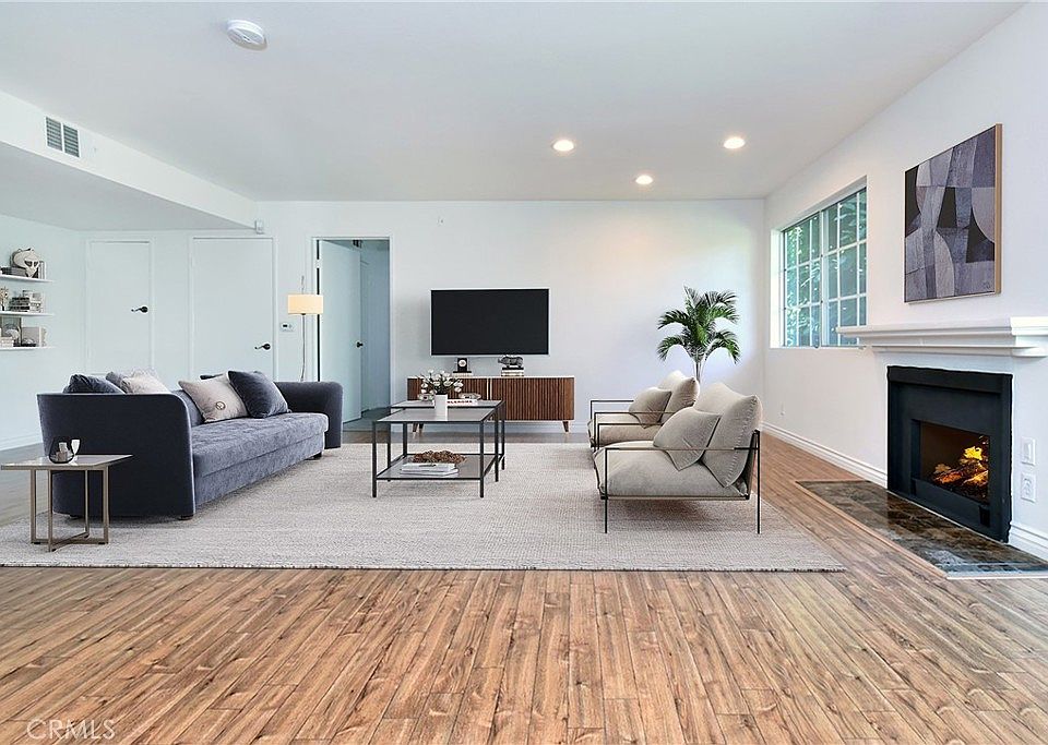 Centrally located and in clean, move-in ready condition, this two bedroom end unit condo with in-unit laundry boasts open living spaces, loads of natural light, a large outdoor balcony and an ideal floorplan with two large en suite bedrooms! Enter into a large and inviting living room with upgraded floors, a gas fireplace, recessed LED lighting and lots of natural light. An open dining area is adjacent, offering the perfect location for entertaining guests or enjoying family dinners. The dining area features a brand new, elegant chandelier above. The kitchen features stainless steel appliances, bar height counters and lots of cabinet storage space. The unit features a split bedroom floorplan with an en suite bedroom on either side of the unit. Both bedrooms boast large, walk-in closets and spacious bathrooms with dual sinks. The balcony is extra long and accessible from the dining room and living area. Two parking spaces that are not tandem in the gated garage and plenty of guest parking, too. Private storage cabinet also. This complex is located within walking distance to Ventura Boulevard, and features a sparkling pool and spa as well as earthquake insurance.