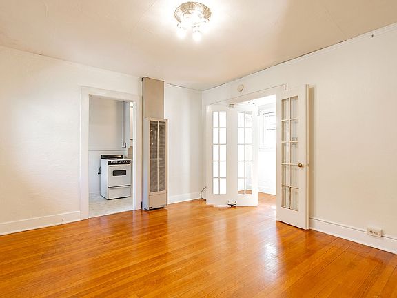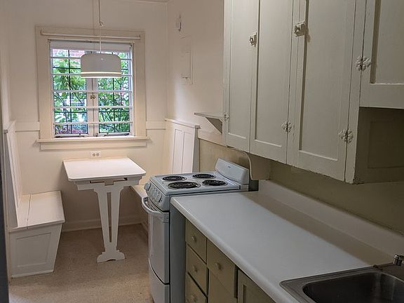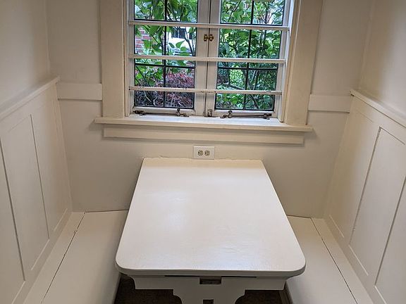 This delightful studio is situated in a garden courtyard. It has a front and back door going directly to the outside, making it feel more like a cottage than an apartment. The kitchen is separate from the main living space and features tall cupboards and a breakfast nook with built-in table and benches that open for storage. Additionally, hardwood floors, large sash windows, and a large walk-through closet make this charming studio an ideal home.
