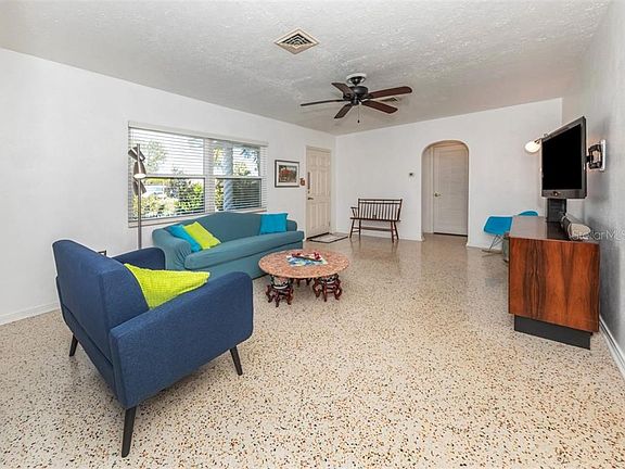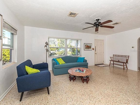 INVITING AND SPACIOUS VENICE ISLAND HOME! 3 bedrooms / 2 full baths / 1 car garage on large lot offering privacy and mature tropical landscaping. This home is located a ½ mile from the historic downtown shops with great restaurants and only a few blocks from the Venice Public Beach and its historic Pavilion! The city tennis courts are close by as well as a few recreational parks. The Higel Park boat ramp, South Jetty and Venice Yacht Club are all within a 5 minute drive. This light and bright Mid-Century classic home features a flexible, split floor plan, Terazzo and tile flooring throughout with over 1,600 square feet of living space with numerous windows to allow for cross-breezes. The spacious master bedroom can accommodate a private seating area, as well as an en-suite master bath with double vanities and tiled walk-in shower. Two additional guest bedrooms have large windows and abundant closet space. The living room leads into the spacious kitchen and dining room area which flows into the privately fenced in backyard with plenty of room for a pool. Relax in privacy or enjoy entertaining on the back patio, or relax in privacy in the large backyard with majestic oak trees, and several fruit trees for the happy gardener. Best of all, this home has great walkability not only to the shops and restaurants but to the beach to enjoy all Venice Island has to offer.