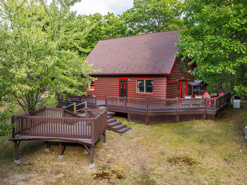 Tucked away on nearly 8 peaceful acres and bordered by state land, welcome to your Adirondack retreat! This fully furnished 3 bedroom, 2 bath turnkey home offers the perfect mix of comfort, seclusion, and proximity to world-class recreation — ideal for outdoor adventures and relaxing mountain vibes. The property features two bedrooms and one full bath on the open concept main floor and the primary ensuite bedroom on the upper floor, vaulted ceilings, a large deck perfect for entertaining, a detached garage, and a full unfinished basement offering limitless potential.