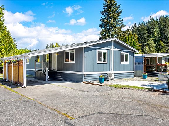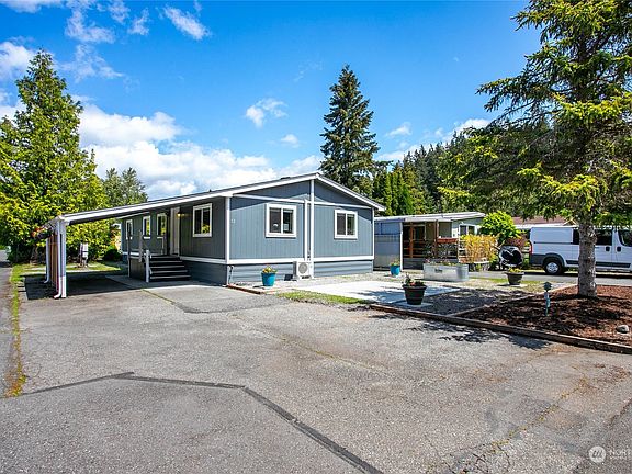 Welcome to a tastefully updated home in a quiet, South Bellingham park. Very bright and open layout. Home has been updated inside and out with new kitchen: cabinetry, high quality stainless steel appliances, lighting and quartz counter tops. Both bathrooms completely remodeled. Laminate flooring throughout main living spaces and bedrooms. Mini split provides A/C. Carport, tons of parking, patio area & storage shed. Close to parks, trails and shopping.