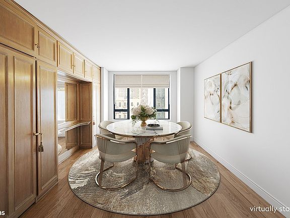 This versatile apartment boasts a living room, three primary size bedrooms (one currently open to living room), each with ensuite baths. The primary bedroom, flooded with light from the south and west windows is enhanced by a dressing area, an enormous closet, and an oversized marble bath with a with a tub and separate shower. The second bedroom is currently being used as a den with spectacular burl wool cabinetry. The third primary bedroom is open to the living room and its bath which is currently used as a walk in closet has the plumbing in place - so easily restored to a full bath.