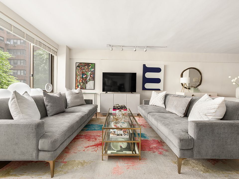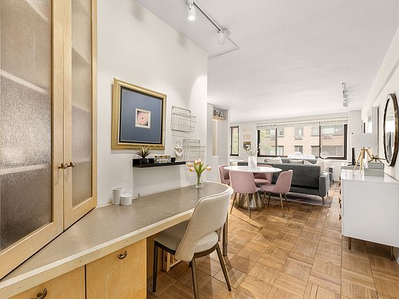 FURNISHED Alcove Studio in a full-service doorman building on the Upper East Side. This lovely home has a spacious layout. There's a full-size dining table and a living area with 2 couches, a coffee table, a large TV and console table. The large entry foyer has a closet and built-in desk. The sleeping alcove has a comfortable queen size bed and 2 nightstands. The kitchen is equipped with a stove, dishwasher, microwave, and a full-size refrigerator. There are parquet floors throughout this home, and through-wall A/C. There are 3 generous closets and great storage space. The apartment is very quiet with bright northern views overlooking the building's landscaped gardens.