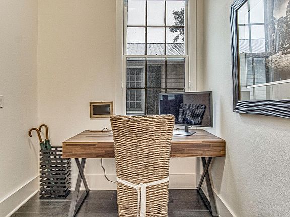 The living room is a serene retreat filled with natural light, eclectic designer furnishings, and a warm, inviting atmosphere perfect for reading or relaxing. A dedicated office nook near the entryway offers a quiet workspace for those working remotely. Throughout the home, curated artwork and decor reflect the owner's travels and Pensacola's storied past.
