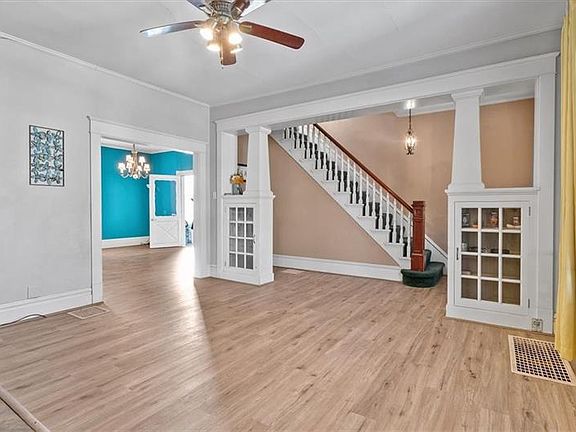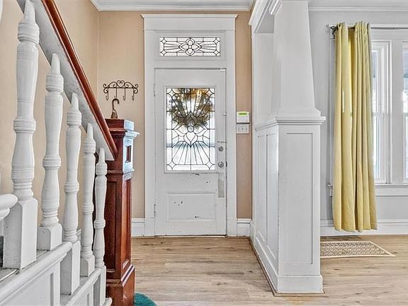 This stately Victorian is situated on a large corner lot and it's home to the neighborhood's favorite pear tree. You are welcomed by a large covered front porch that is consistent with a period home and presents an invitation to explore the richly appointed interior. You are welcomed by a grand foyer with intricate staircase, and chandelier. The high ceilings and decorative fireplace stand out in the living room, and the large dining room has built-in cabinets with access to the sunroom or the updated kitchen. The updated kitchen offers newer counters and freshly painted cabinets. You can't help but notice the original wood work as you make your way to the second floor. The 2nd floor offers two large bedrooms with great closet space and an updated full bath. The third floor hosts the massive 3rd bedroom and it offers plenty of storage. The home offers a privacy fenced yard and a spacious lot with a 1 car detached garage. Updates include: newer roof, furnace, flooring, paint, fencing.