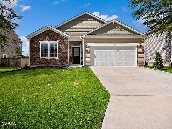 Stunning one-story home nestled in the tranquil Tyler home on the lake subdivision. Built-in 2021, this meticulously maintained residence offers an array of modern amenities for comfortable living. As you approach the property, you'll be greeted by an inviting covered front porch, well-manicured flower beds, and a 2-car garage. Inside, the home boasts beautiful LVP flooring throughout the main living areas creating a seamless and stylish aesthetic. The spacious living area seamlessly opens up to an inviting eat-in kitchen, a perfect space for family gatherings and entertaining guests. The kitchen features elegant granite countertops, recessed lighting, stainless steel appliances, and a generously sized kitchen island complete with a sink. From the adjacent dining area, you'll enjoy picturesque views of the expansive backyard. The living room's focal point is a cozy corner fireplace, adding both warmth and charm to the space. Your laundry room is a more enjoyable space with built-in shelving and contemporary wallpaper, making laundry tasks a breeze. The primary bedroom offers vaulted ceilings, plush carpeting, a walk-in closet, and a well-appointed ensuite bathroom, complete with dual vanity, a walk-in shower, and a linen closet for your comfort and convenience. Additionally, there are three more bedrooms, all featuring comfortable carpeting, and they share a full-sized bathroom, making this home ideal for accommodating guests or creating a functional home office space. Step outside to discover a covered porch that overlooks the low-maintenance backyard, providing an ideal spot for outdoor relaxation, barbecues, and gatherings with family and friends. This property truly offers a serene and comfortable living experience. Amenities include a pool house and community pool. 61-acre lake with 2 miles of walking trails for the avid outdoorsman. Conveniently located 10 minutes from downtown New Bern and a short drive to MCAS Cherry Point.