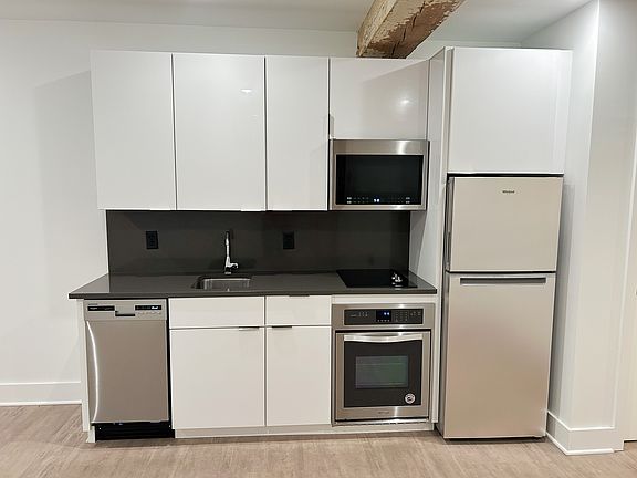 The high-end studio features updated quartz countertops and backsplash, stainless steel appliances, frameless cabinetry, exposed brick, and luxury vinyl tile flooring. LED lighting and separated sleeping area with custom closets.