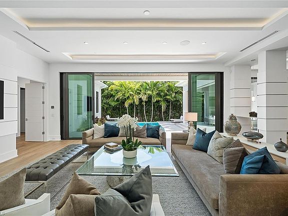 This 2020 architectural masterpiece by Gulfstream Homes, Kukk Architecture and Koastal Design Group is both modern and inviting. Tiered waterfalls and a grand mahogany front door welcome you into this ethereal home with floating cloud ceilings and recessed soffits, European wood flooring and quality finishes throughout. A great room with elegant architectural columns and a gourmet kitchen overlook the expansive outdoor living area with an outdoor kitchen, gas fireplace, television, and motorized screens and shutters. Lounge at the tranquil saltwater pool with large sun shelf and luxurious spa, and then rinse off in the true outdoor shower. Retreat to the serene primary suite with sitting area, incredible closet and luxurious bathroom. One additional en-suite bedroom on the first floor and two en-suite bedrooms and an en-suite loft/den that could be converted to another bedroom complete the home. Additional features include a Control4 smart home system, three-car tandem garage with lift, 1,000-gallon propane tank, whole house generator and more. Offered furnished with exclusions. The Moorings is a premier Naples location with opportunity to join the Moorings Resident Beach Club.