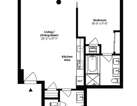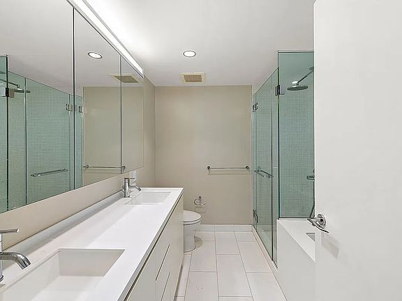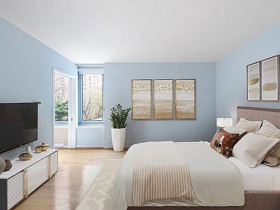 Fun, bright, and big. Residence 301 has a huge open plan and checks each and every box. From the oversized windows facing open gardens to the pristine architecture that comprises the community known as the Dillon, this home is different. A one bed condo with sleek modern finishes, 301 is anything but ordinary, with in-unit laundry, 1.5 baths, central AC, powered blinds, and wide plank wood floors. The king size bedroom has a five piece primary bathroom with double sink vanity, deep soaking tub, and separate stall shower. Modern open kitchen fit for a chef - white cabinetry, quartz countertops, Liebherr refrigerator, Miele range, microwave, and dishwasher. An additional half bathroom resides off of the living room. A perfect home for entertaining. The Dillon Condominium is in the center of it all with the theater district right outside of the door, avenues full of lively restaurants and shops, and minutes from Lincoln Center and Central Park. A full service building including 24-hour doorman, fitness center, outdoor garden, resident lounge, and playroom. Photos are virtually staged. Pets on case-by-case basis.