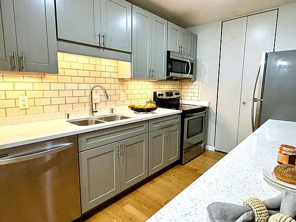Subway tileQuartz countersOpen floor planLarge pantryGray cabinetryPrivate patioCourtyard facing