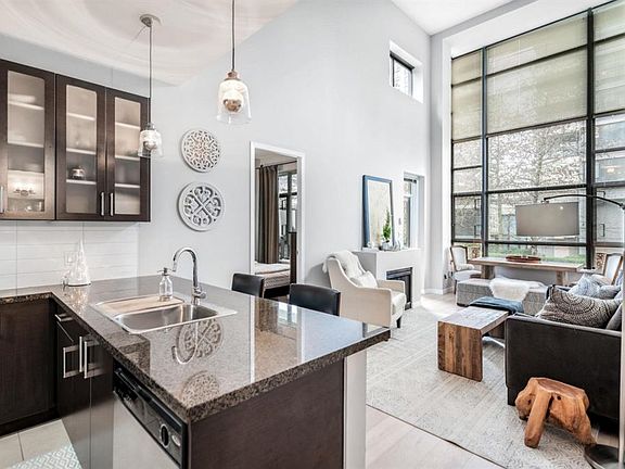 Discover a rare west-facing, ground floor townhouse in the sought-after OMA 2 community. This 2 bedroom, 2 bath home offers ~879 sq ft of stylish living with soaring 18-foot ceilings, fronted by 3-sided bay windows that brings in abundant natural light.