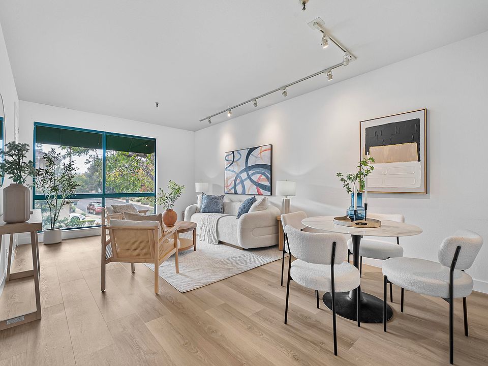 Escape into the hidden, resort-like community of the award-winning Palo Alto Redwoods. Just a short walk to shops and restaurants, this lushly landscaped enclave feels like a world away, surrounded by majestic redwoods and serene greenbelts. This one-bedroom, one-bath condo is quietly situated at the back of the complex, offering western hill views and a peaceful setting. The residence includes a dedicated storage unit and an assigned parking space only steps from the building’s elevator, leading directly to your front door. Inside, recent updates bring a modern touch, with HOA-approved hardwood-style LVT flooring, fresh interior paint, and a remodeled kitchen featuring quartz countertops, stainless steel appliances, and a wine refrigerator. The spacious living room is highlighted by soaring ceilings and large windows that flood the home with natural light. A generously sized bedroom with two closets, a private balcony, a full bathroom with an oversized vanity and linen storage, plus an in-unit washer and dryer, all add to the convenience and comfort. Community amenities include a pool, spa, sauna, and guest parking — creating a true retreat in the heart of Palo Alto.