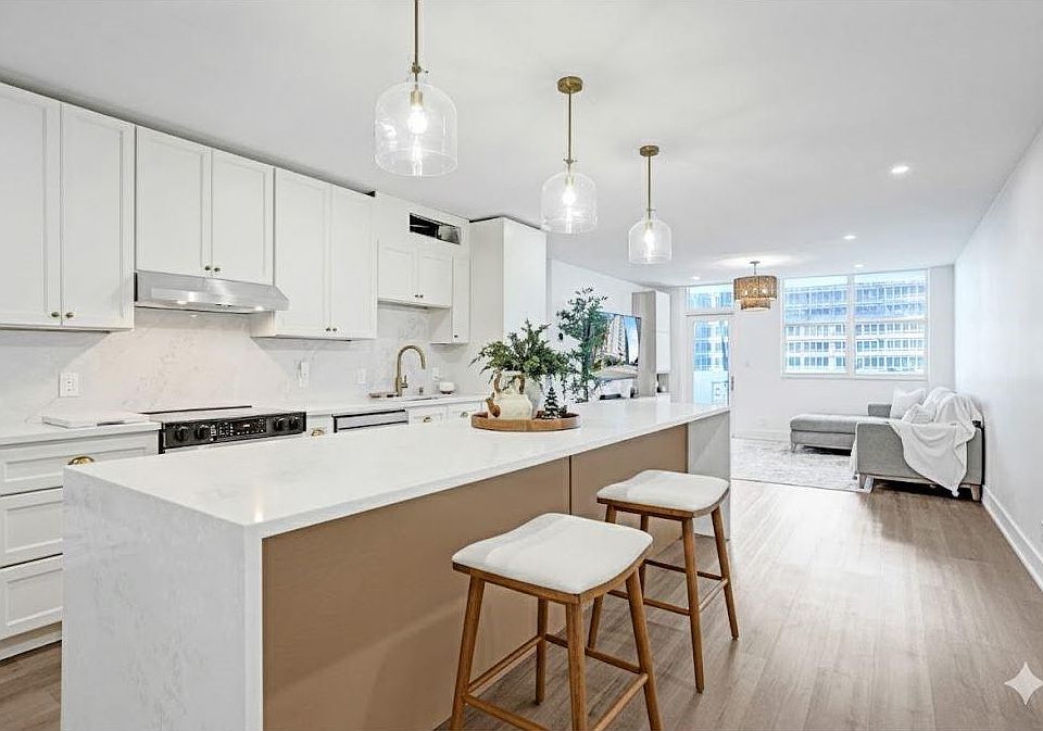 One-of-a-kind unit undergoing a full renovation and transformed into a stunning 2 bed / 2 bath layout with no expense spared. No other property has been redesigned to match this incredible floorplan. Features include luxury vinyl flooring, porcelain tile in bathrooms, shaker doors, and a modern wood kitchen with soft-close cabinetry. Quartz countertops with waterfall edges and full backsplash, stainless steel appliances and elegant pendant lights over the island complete this exceptional home. Unit comes with washer /dryer. Impact windows and doors throughout. Building has gym, pool, 24 hr security, private beach access, community room and more! PLEASE NOTE THE UNIT PHOTOGRAPHED IS NOT THE UNIT FOR SALE. THE UNIT FOR SALE WILL LOOK EXACTLY LIKE THIS WHEN COMPLETED BY EARLY NEXT YEAR.