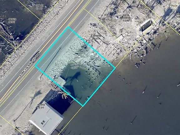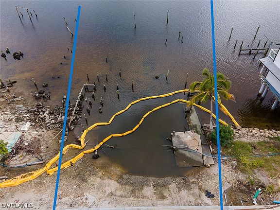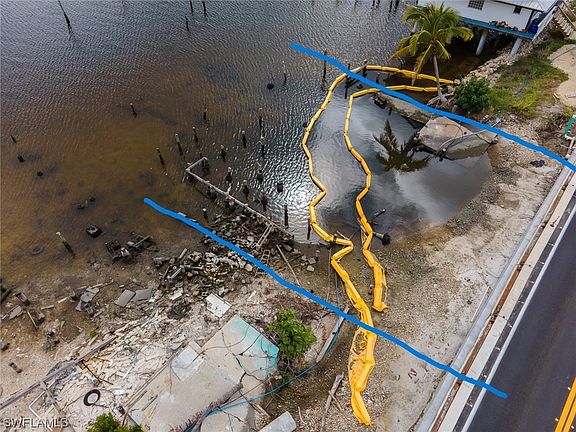 Matlacha Bayfront Lot available. Property was damaged in Hurricane Ian and was previously a duplex. Permits are in place for replacement of the 1,535 square foot commercial dock for four slips. Proposal in place to bring in fill to restore the lot.