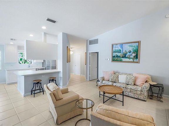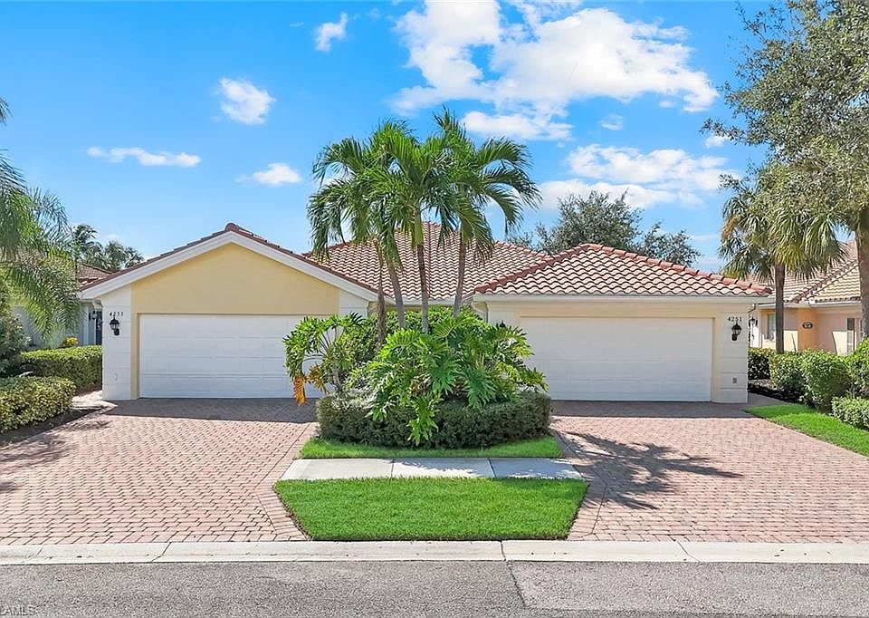 Welcome to 4251 Redonda Lane in Island Walk. Island Walk is a popular gated community located in North Naples and is only 7 miles from Vanderbilt Beach. This Southwestern Long Lake View Capri Attached Villa offers 2 spacious bedrooms, 2 bathrooms, a 2-car attached garage, along with a private side entrance. Entertain family and friends on your caged lanai with magnificent lake and bridge views. Walking inside, you'll instantly notice the open concept floor plan with a spacious kitchen and Great room. Plus, right outside of your main living area, you have a large screened-in lanai with a privacy wall. The Roof was replaced in 2023. Outside of your front doors and within the gates, Island Walk is bustling with Activities and Amenities. There are miles of walking paths and bridges for strolling and biking, a Resort style pool and a Lap pool, a Fitness center, Tennis & Pickleball courts, a wonderful restaurant, post office, gas station, Bocce courts, car wash, beauty and nail salon and even a putting green. There are so many options close by for dining and entertainment that are just a short drive away.