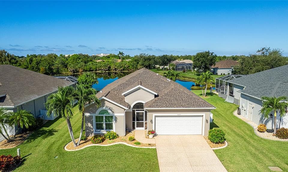 Welcome to this beautifully cared-for home in the desirable Woodmere Lakes community of Venice. Set on a peaceful pond view, this property combines comfort, function, and Florida lifestyle living. From the manicured lawn and landscaping to the screened front porch entry, you’ll see the pride of ownership throughout. Inside, the open floor plan with laminate flooring and split-bedroom design offers both style and privacy. The owner’s suite is tucked away on its own side of the home, while the guest bedrooms are positioned for convenience with an en-suite and shared bath. At the back of the home, you’ll love the west-facing orientation — perfect for enjoying stunning sunsets. The 28-foot-wide screened lanai is the ideal outdoor retreat, enhanced with retractable sun shades for your comfort year-round. This home has been thoughtfully updated with hurricane-impact windows, an impact garage door, and a whole-home surge protector. Important systems have already been taken care of: roof (2019), AC (2017 with regular maintenance), water heater (2015), re-pipe (2009), plus a new irrigation pump and vent cleanings in 2024. Move in with peace of mind knowing the big-ticket items are done. Perfectly located, you’re just minutes from Venice’s world-class golf courses and Gulf beaches like Manasota Key, Venice Beach, and Nokomis Beach. Downtown Venice offers charming shops and dining, while the Wellen Park District provides even more restaurants and entertainment. Sarasota Memorial Hospital is nearby for top-rated healthcare. Spend your evenings at the Venice Jetty watching dolphins play and boats cruise by. This home truly delivers the full Florida lifestyle.