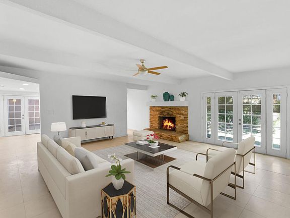 Stunning stone fireplaceNew laminate flooringFresh interior paintTravertine flooringCorner lotWood-beamed ceilingsTons of natural light