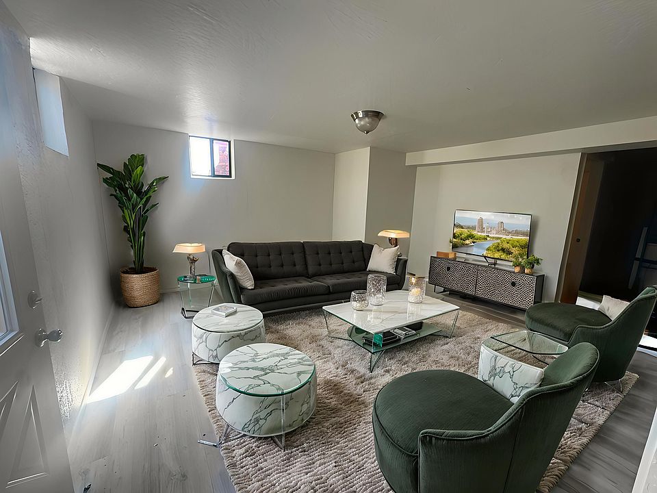 Brand new renovated 1 bedroom 1 bath basement unit in an apartment building. Spacious living room and bedroom. The property features AC cooling and heating, vinyl luxury plank flooring throughout the unit. Appliances are provided, includes fridge and oven.