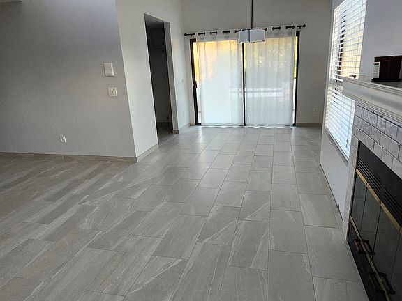 This light-filled home features expansive vaulted ceilings, a large private balcony, and a private entryway with wooden stairs leading to newly tiled living areas. The modern kitchen is equipped with quartz countertops, an oversized sink, a charming bay window, and generous cabinet space.