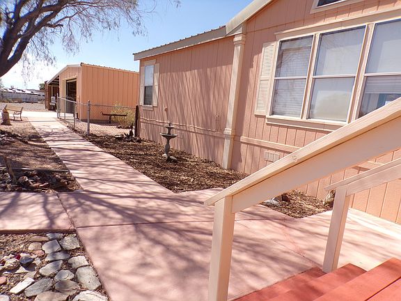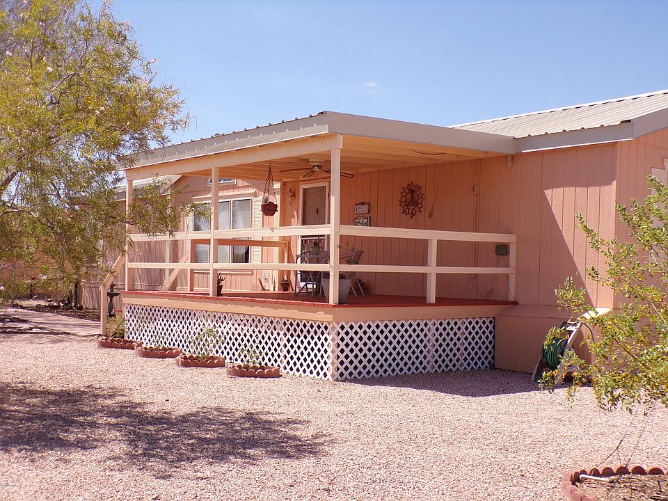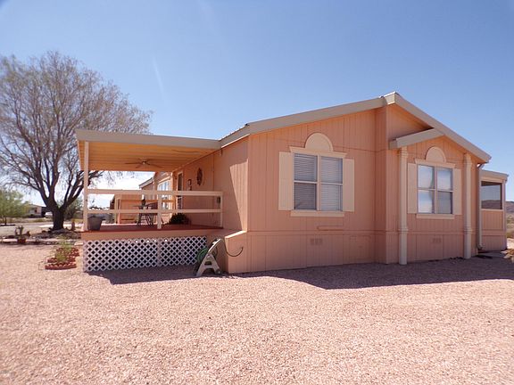 This home is luxurious and beautiful. Home and land are spotless, clean. 1.86 acres at end of cul-de-sac.1,704 sq. ft. 3-bed 2-bath 1999 manufactured home.Perfect for large families.New metal roof,new A/C heat unit, keeps you cool and warm.Home contains vaulted ceilings and fans, large kitchen plenty of cabinets,middle sink/island. Kitchen transitions into dining area Living area big and comfy,lots of room.3 large bedrooms, master bedroom has x-large bathroom, garden tub,dual sinks. Bedrooms 2&3 very nice sized. Laundry/pantry has shelving and large laundry area.1 covered front patio, 2 covered back patios areas,one a 14x30 Arizona room, the other 14x20 covered patio. Both offer beautiful Arizona sunsets.24x40 shop/garage has concrete floor,R.O.system,110,shelves, auto garage door opener & 1/2 bath.20x40 covered carport for rigs and trailers and other things needing protection. Home backs to State Trust land,lots of privacy. Entry has graveled circular drive,desert landscaping.Beautiful concrete walkways in front and side. Fenced pet area for keeping your little family members safe. 2 full service RV hookups that have privacy. Call today.