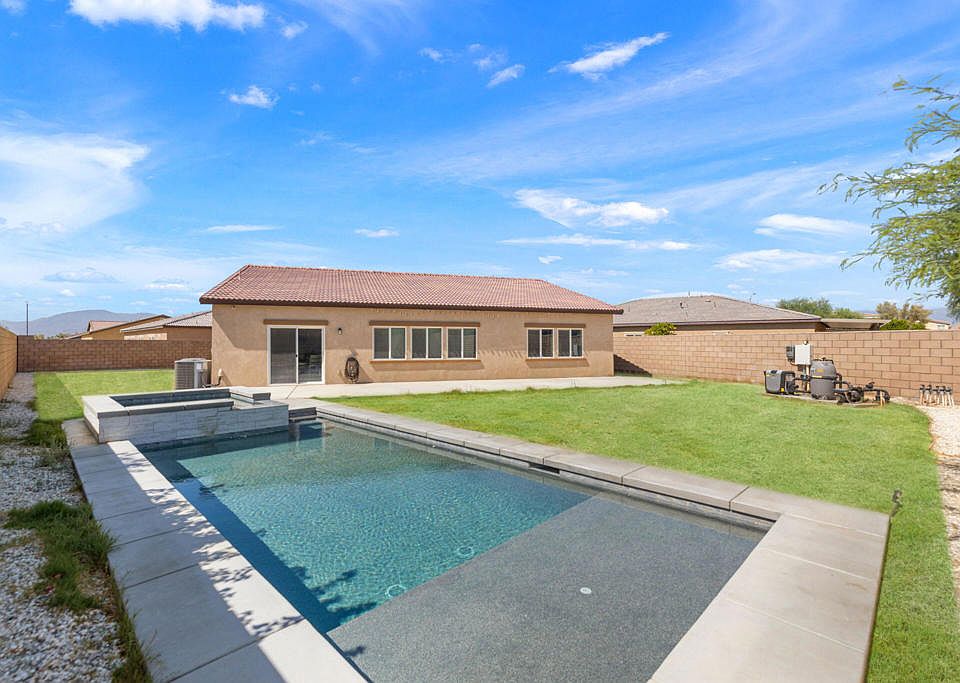 Priced to SELL! Welcome to this stunning home in the highly desirable gated community of Hacienda, proudly offered by the original owners. Nestled at the end of a quiet cul-de-sac, this property sits on an oversized lot with a sizeable side yard, offering ultimate privacy--no neighbors directly behind--and beautiful mountain views. Enjoy the brand-new custom pool and spa (2023) featuring pebble tec finish, party lights, and smart remote control via app--perfect for relaxing or entertaining. Inside, the home boasts 4 bedrooms plus a den, ideal for an office, media room, or extra guest space. The kitchen is a chef's dream with white cabinetry, stylish backsplash, stainless steel appliances, a large island, and a double door pantry. Additional upgrades include plantation shutters, updated light fixtures, and more. Located within the IID electric district for lower energy costs and a low $125/month HOA, this home blends functional and comfortable living. A must-see!
